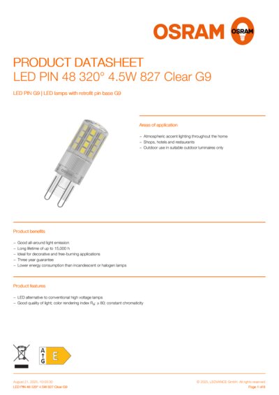 LED PIN 48 320° 4.5W 827 Clear G9 | G9 | 4.5 W | 220…240 V | 15000 h | 600 lm | 48 W | 320 ° | No |