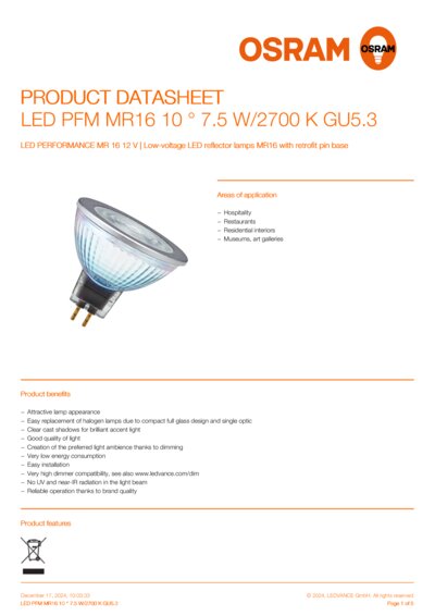 | Product remark | All technical parameters apply to the entire lamp, Due to the complex production process for light-emitting diodes, the typical values shown for the technical LED parameters are purely statistical values that do not necessarily match the actual technical parameters of each individual product, which can vary from the typical value |